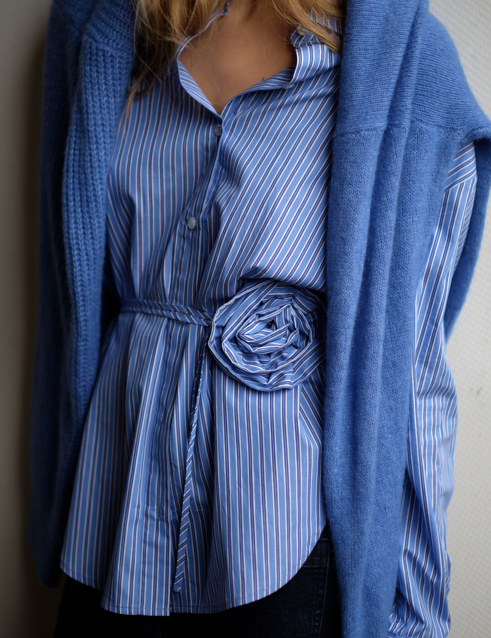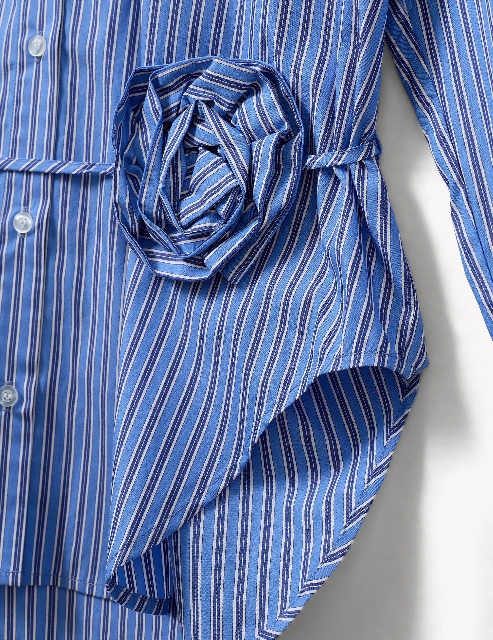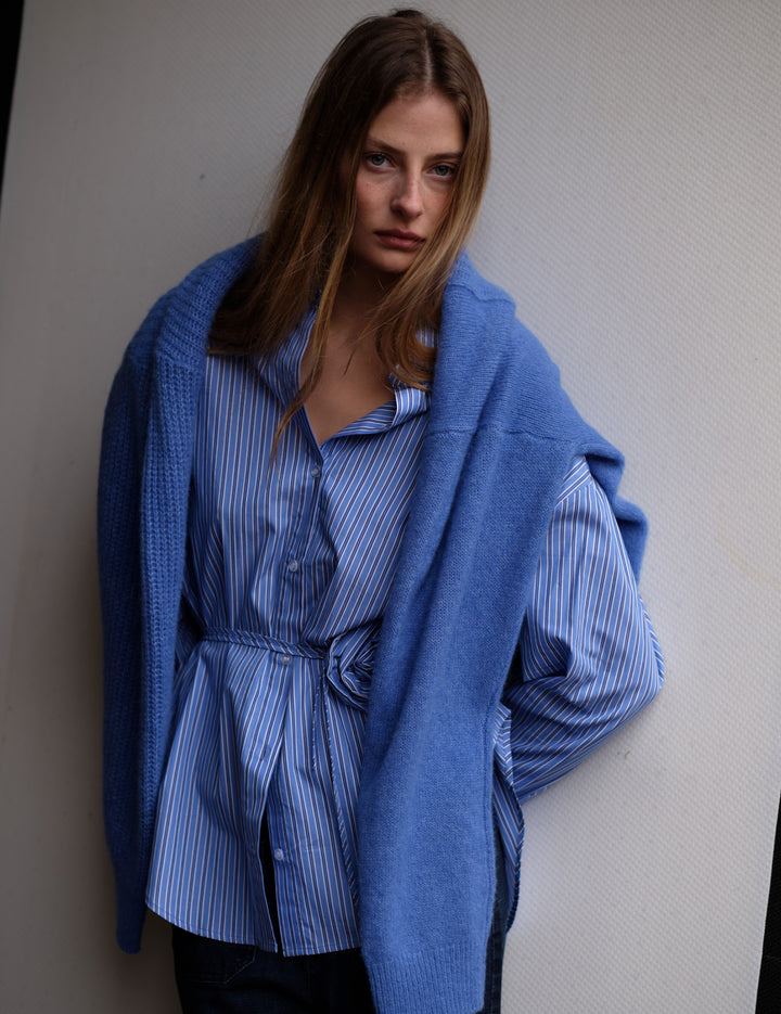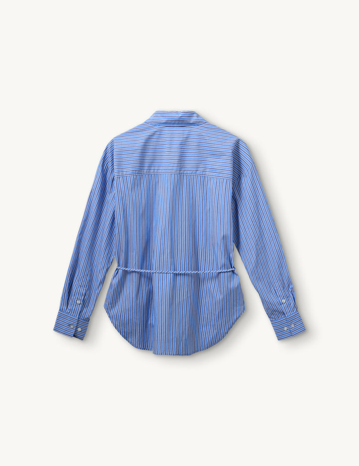 The Bowen Belt Shirt features crisp blue, white, and navy stripes, a traditional collar, and classic button placket—elevated by a cinched waist with a belt that ties into a delicate, flower-like knot. This thoughtful detail transforms a timeless silhouette into a modern statement piece, balancing structure and softness with effortless ease.