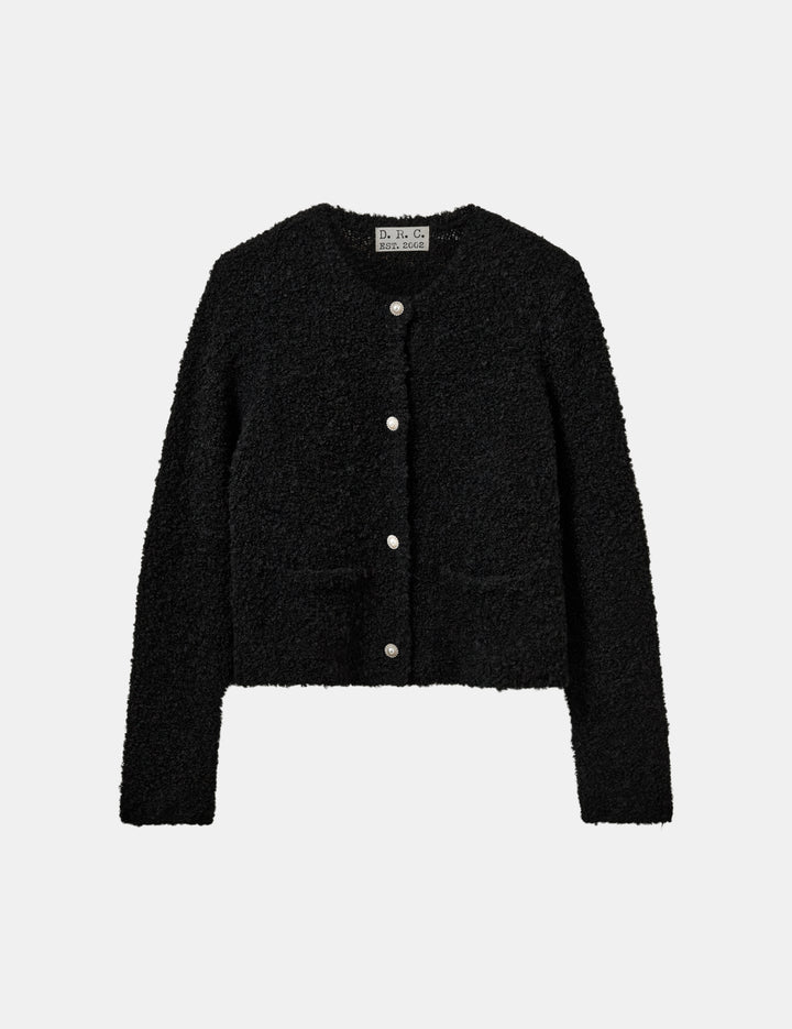 A vintage inspired cardigan style jacket, made from a super soft and cozy bouclé fabric. This playful style is easy to wear for casual or more dressy occasion. The embellished button details elevate the look of the piece and add an extra elegant touch.