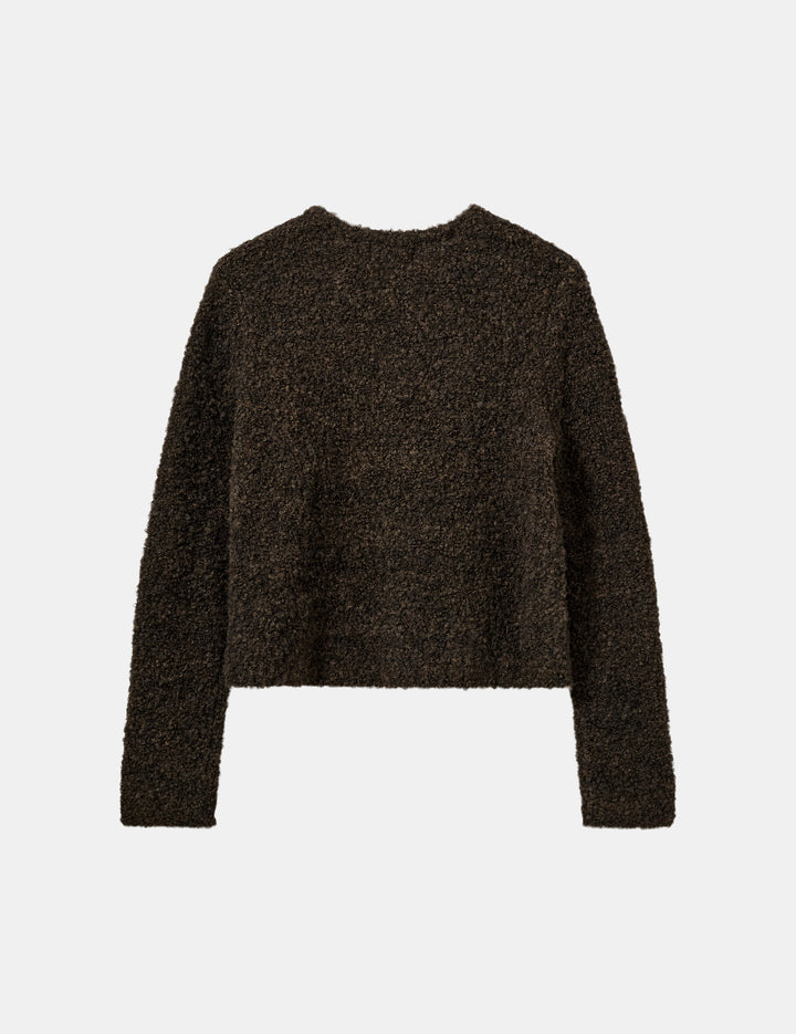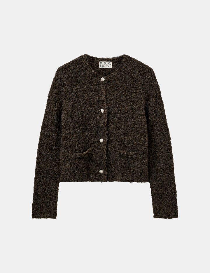 A vintage inspired cardigan style jacket, made from a super soft and cozy bouclé fabric. This playful style is easy to wear for casual or more dressy occasion. The embellished button details elevate the look of the piece and add an extra elegant touch.