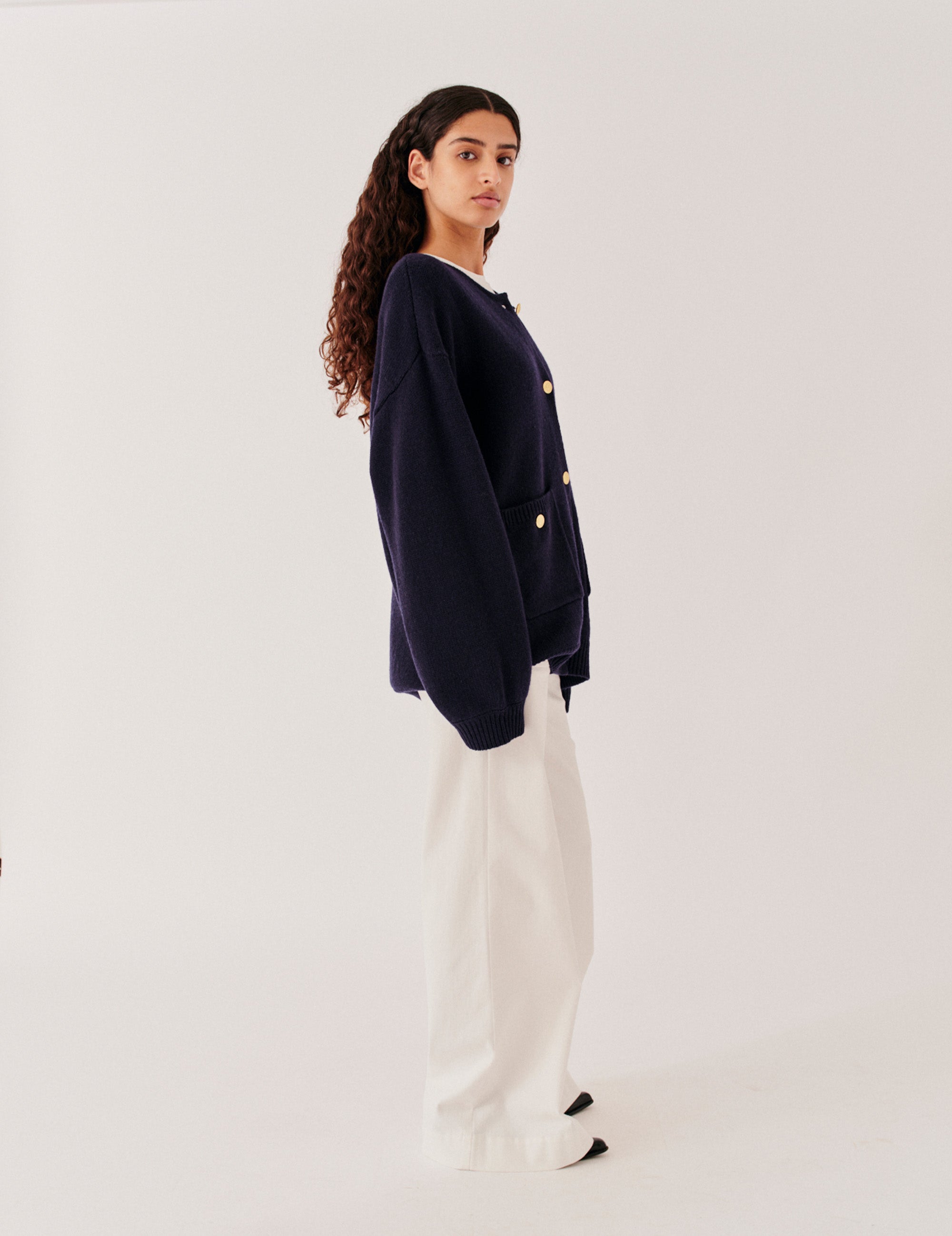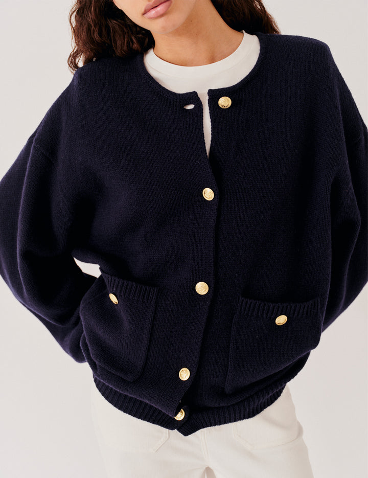 Casual yet refined. The Carmen Button Bomber is a knit jacket in 100% wool, featuring a classic bomber silhouette with two practical pockets.