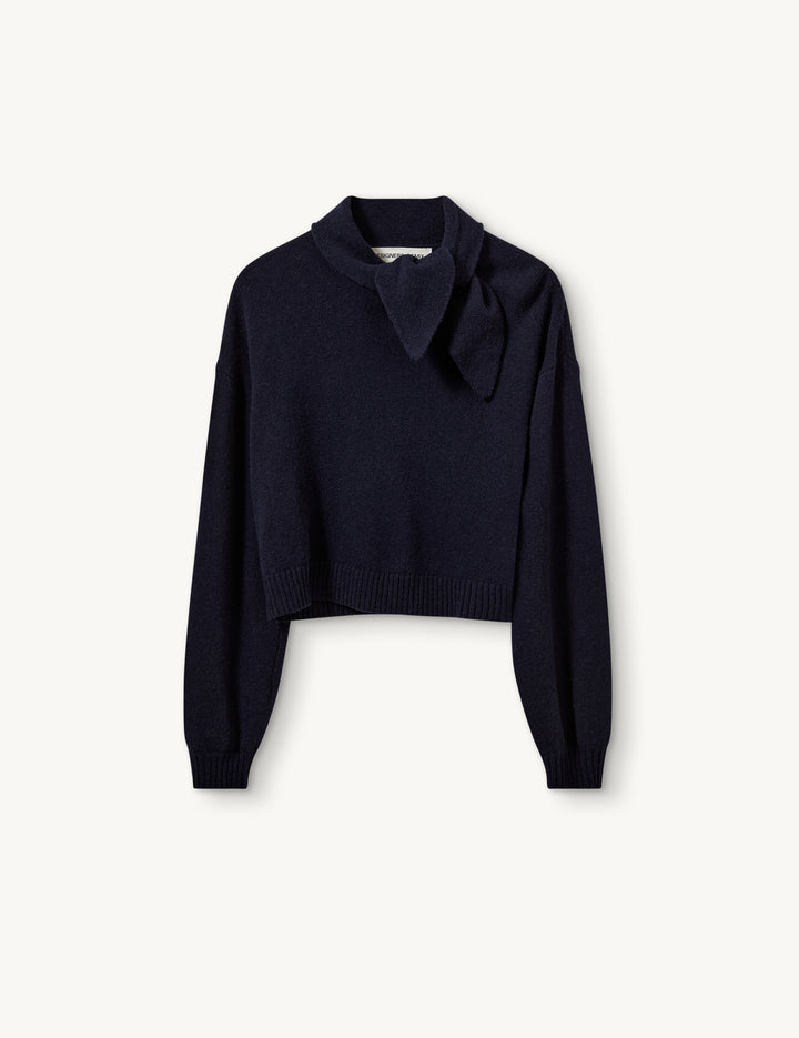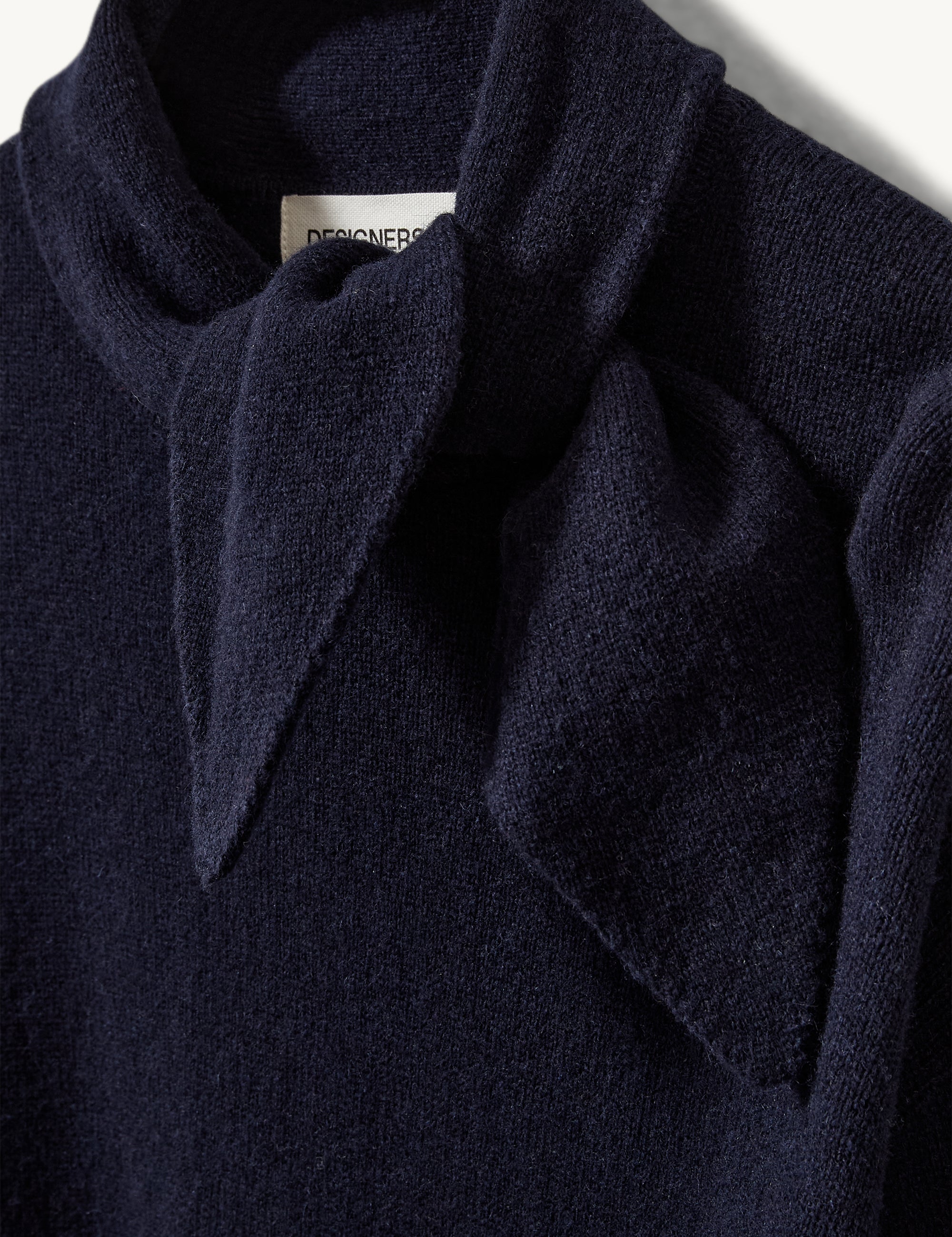 The Carmen Scarf Sweater is crafted from 100% wool, offering natural softness and structure in equal measure. Its loose fit is balanced by a round neckline, while a short, matching scarf adds a subtle layered detail. A contemporary knit with a confident silhouette—designed to wear with ease, styled with intention.