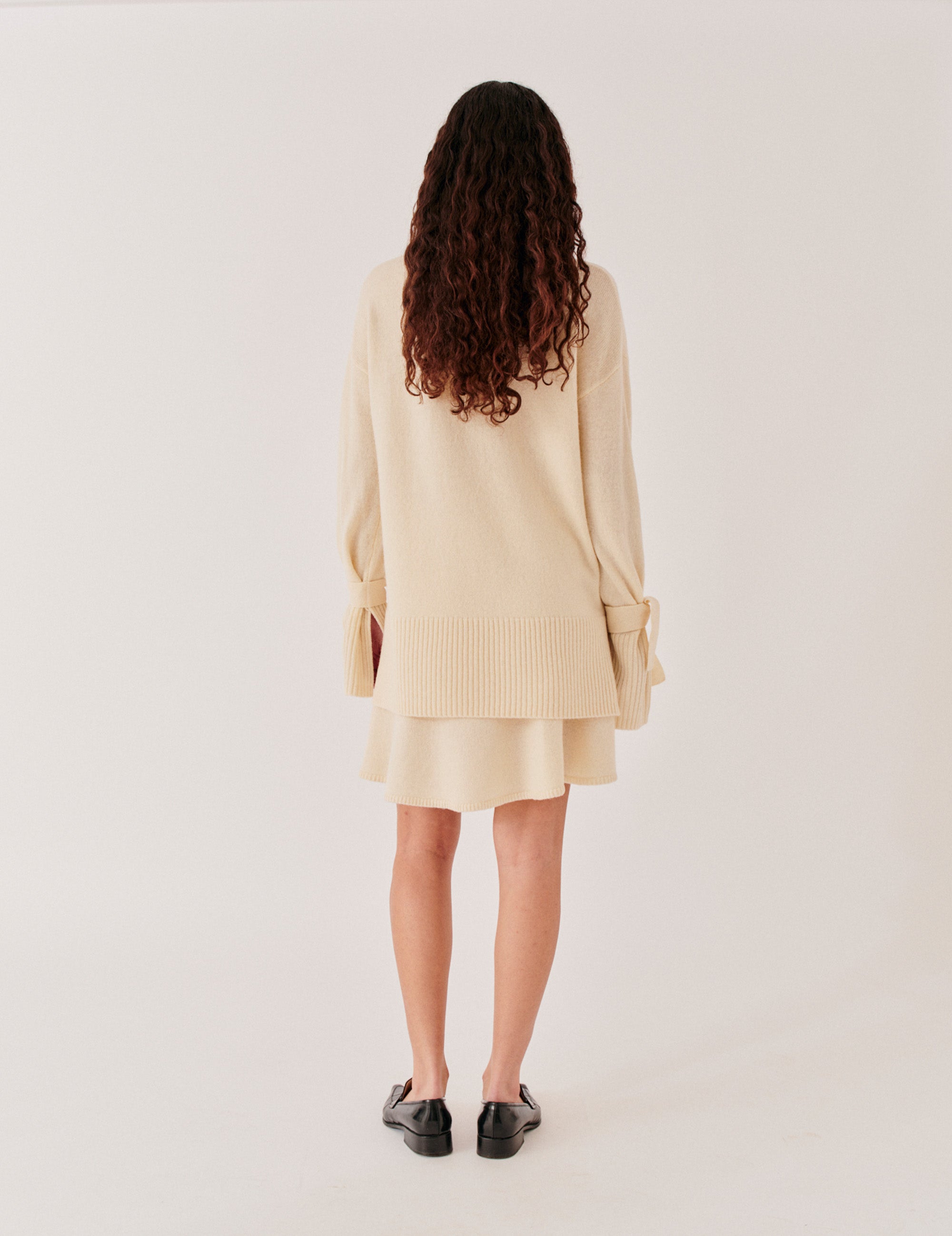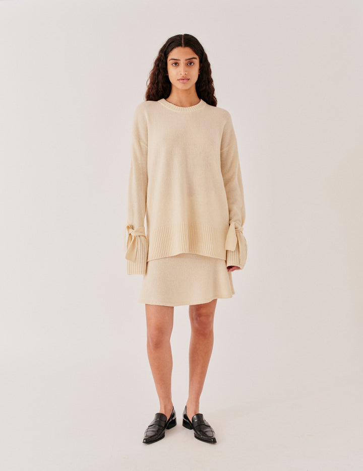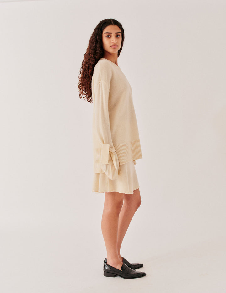 The Carmen Sleeve Knit is made from 100% wool, offering a soft, relaxed fit that drapes with ease. Finished with a round neckline and bow-tied bishop sleeves, it brings a subtle sense of shape and detail. Pair it with the Carmen Flare Skirt or wear it on its own for an effortless, textural look.