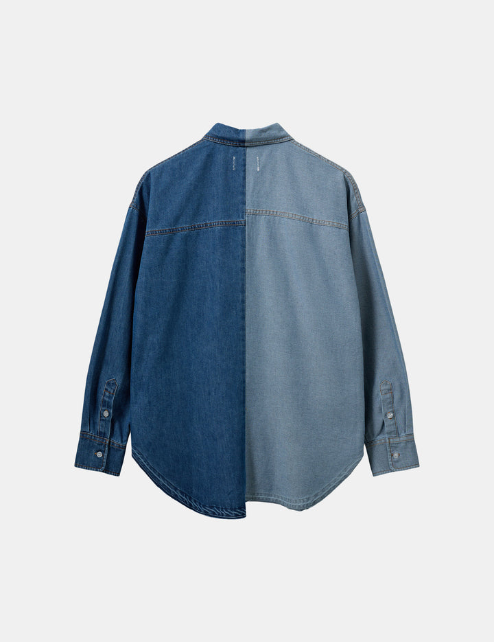 A contrast button down denim shirt with asymmetrical cut and oversized fit. Elevated by mismatched pocket detailing.