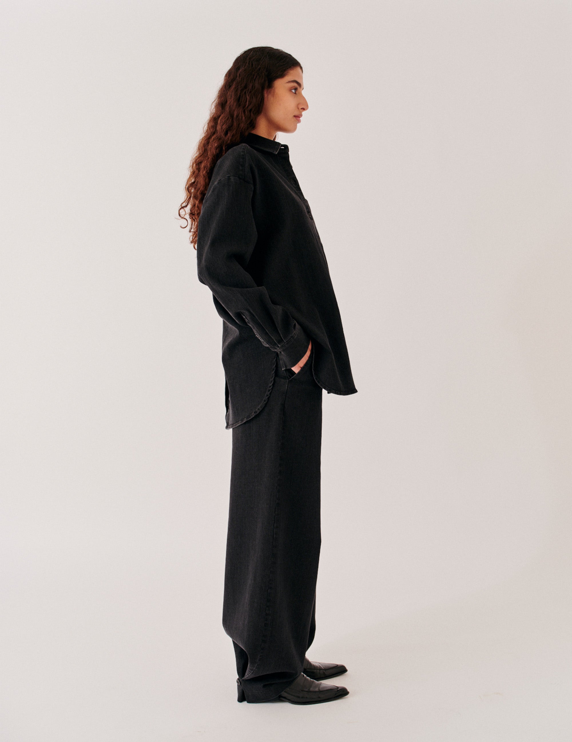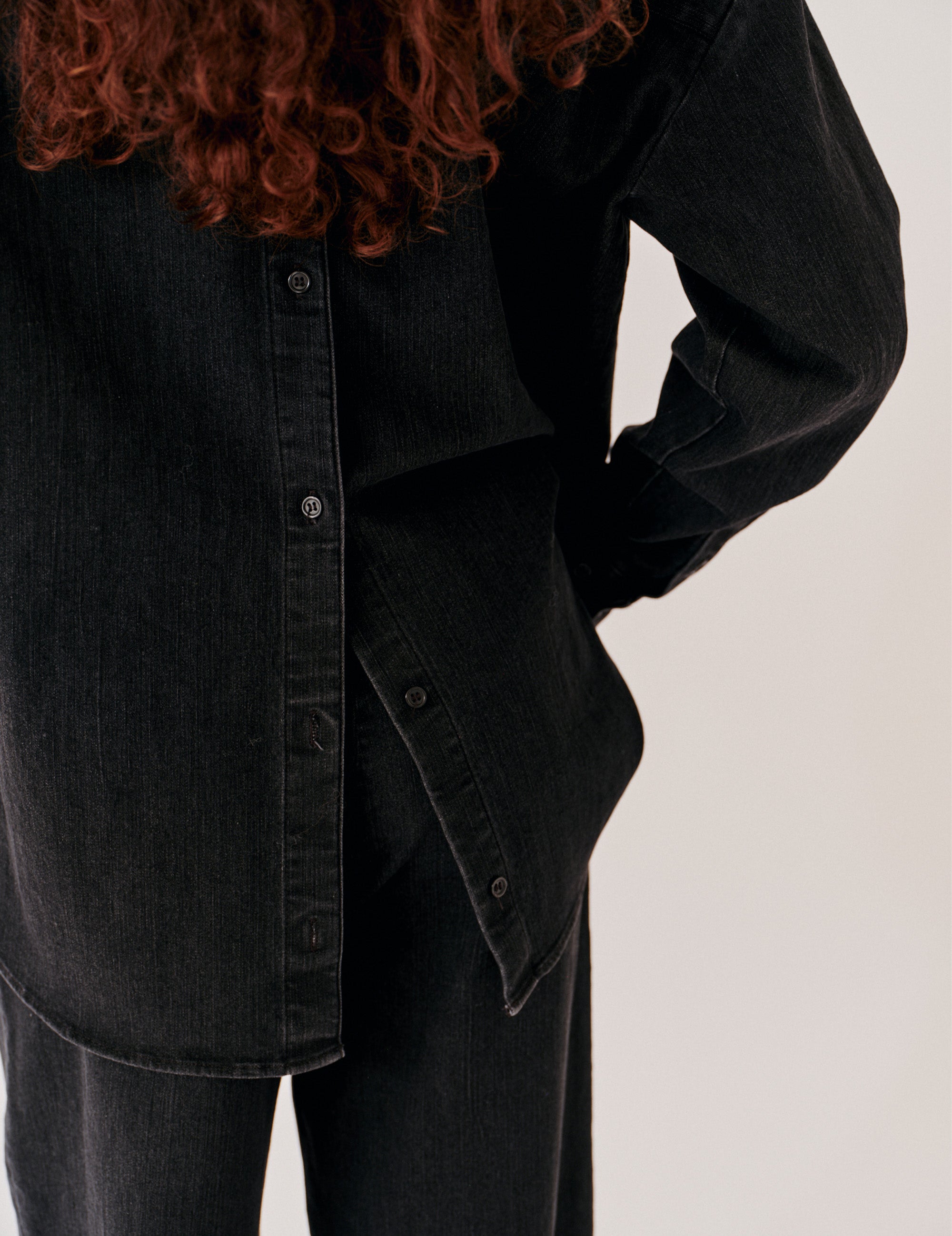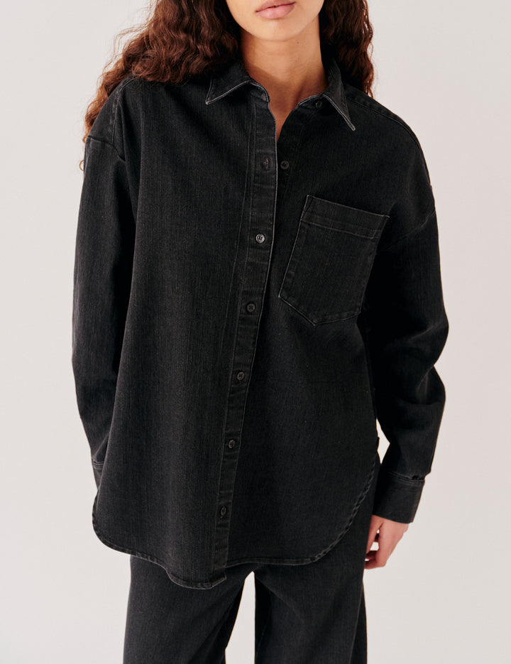 Effortlessly modern. The Merrit Oversized Shirt is cut in stretch denim with a relaxed fit and subtle back button detail—designed to pair perfectly with the matching Barrel Pants.