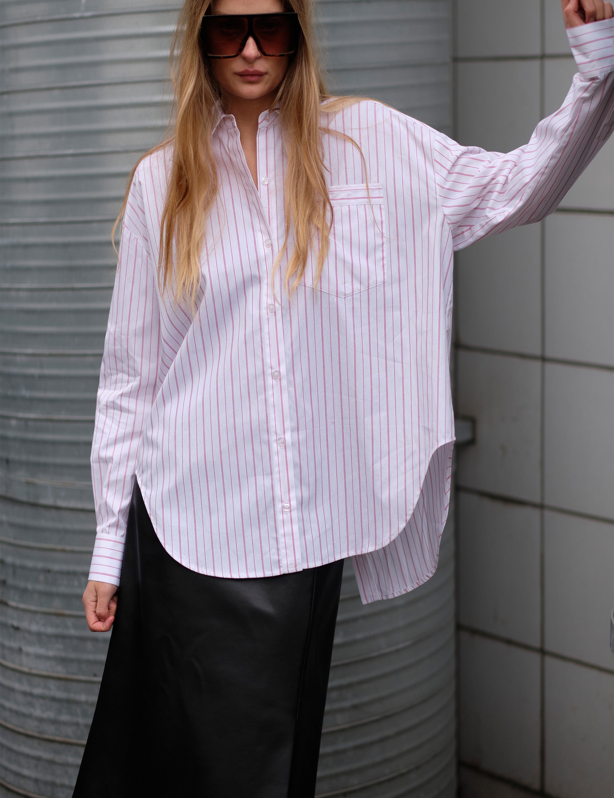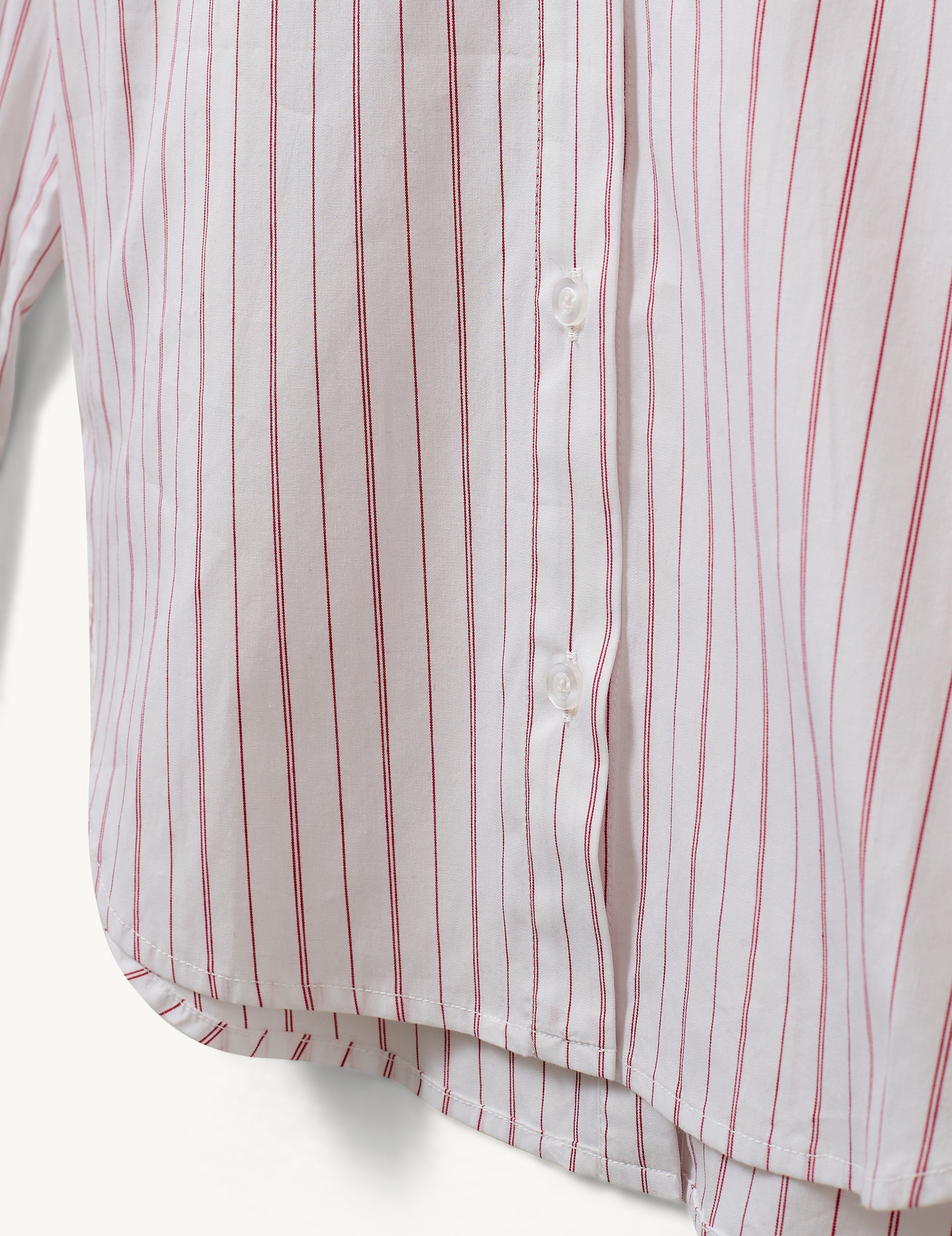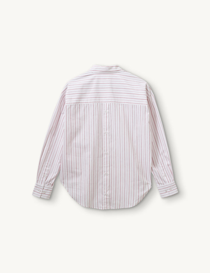 The Ray Oversized Shirt offers a classic fit with a relaxed silhouette, featuring a crisp collar and button placket for everyday polish. Delicate thin red and white stripes add a subtle pop of pattern, bringing quiet character to a wardrobe essential. Perfect worn loose or tucked, it’s a versatile piece designed for comfort and style.