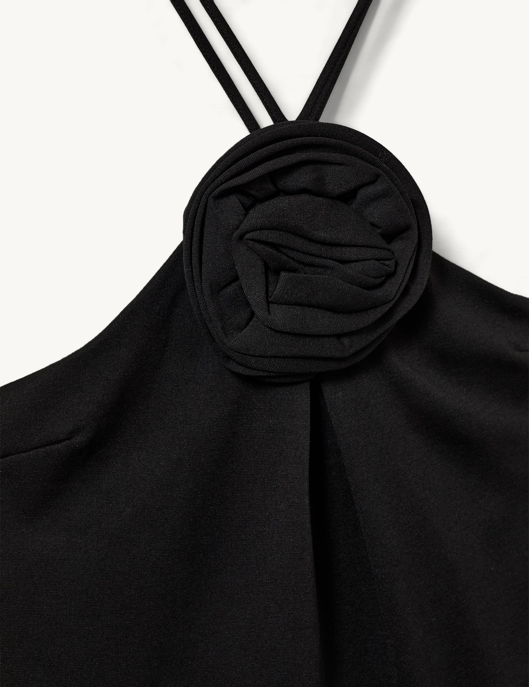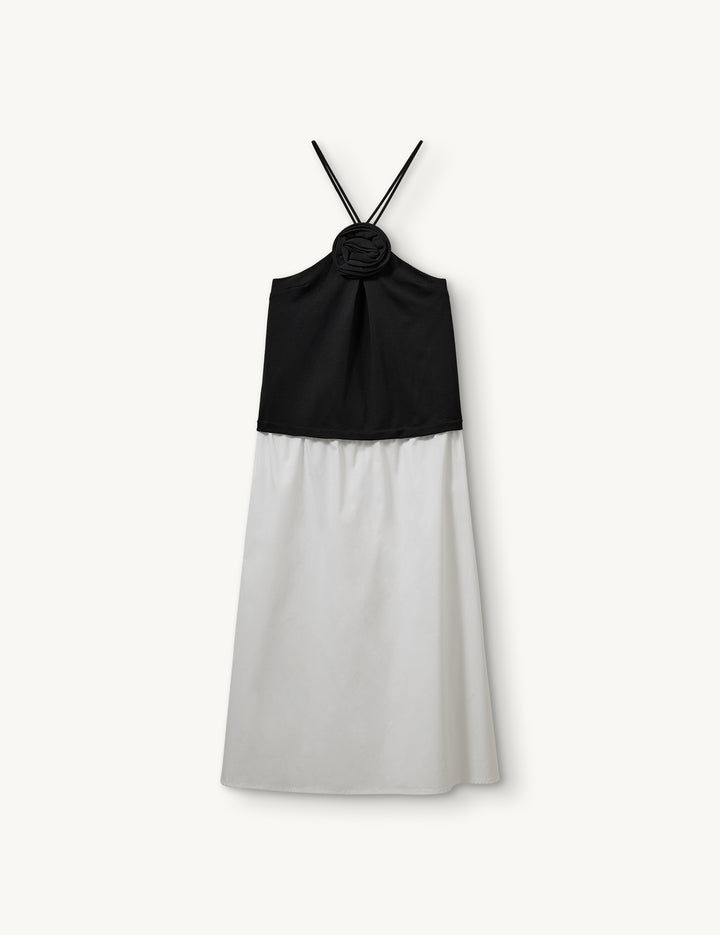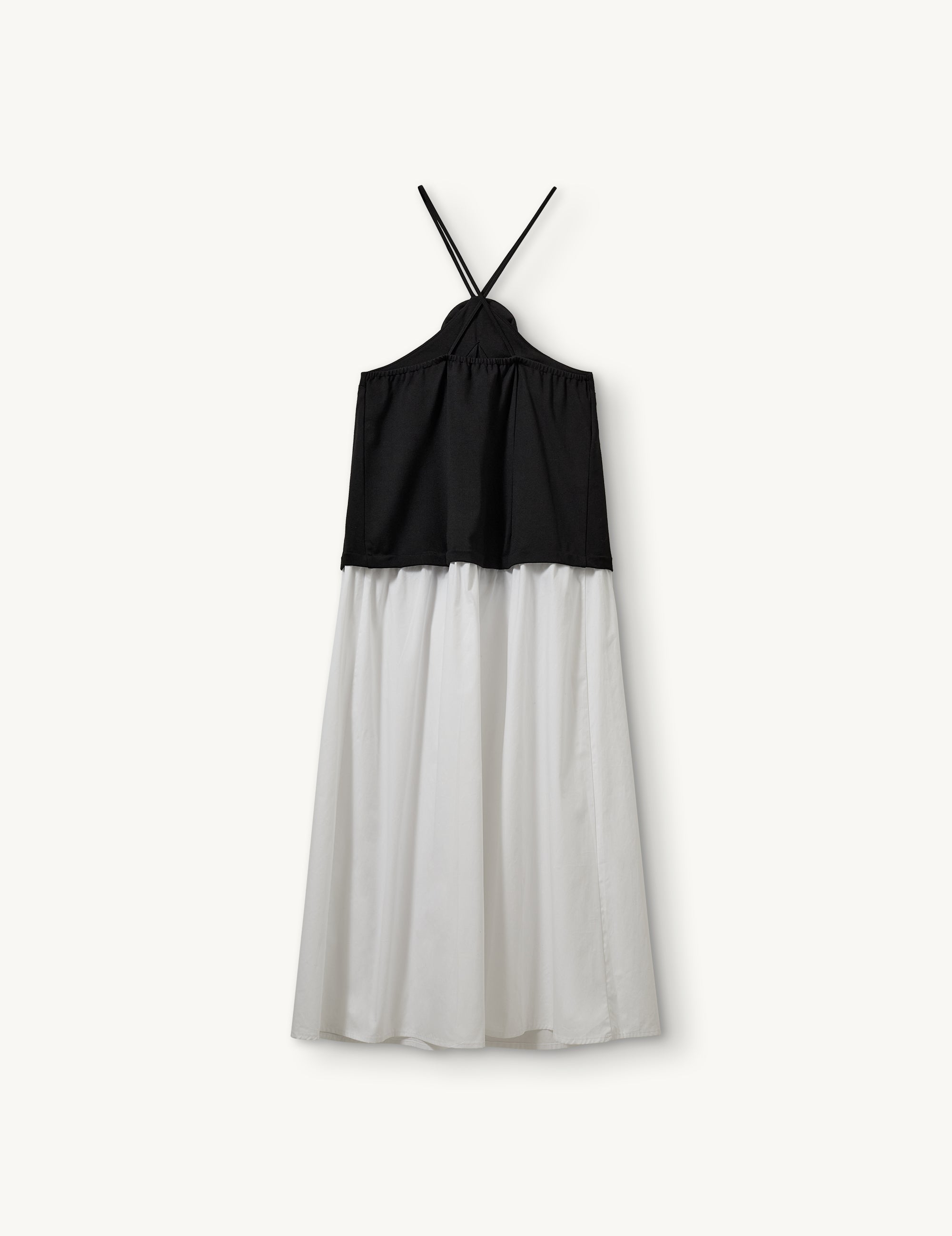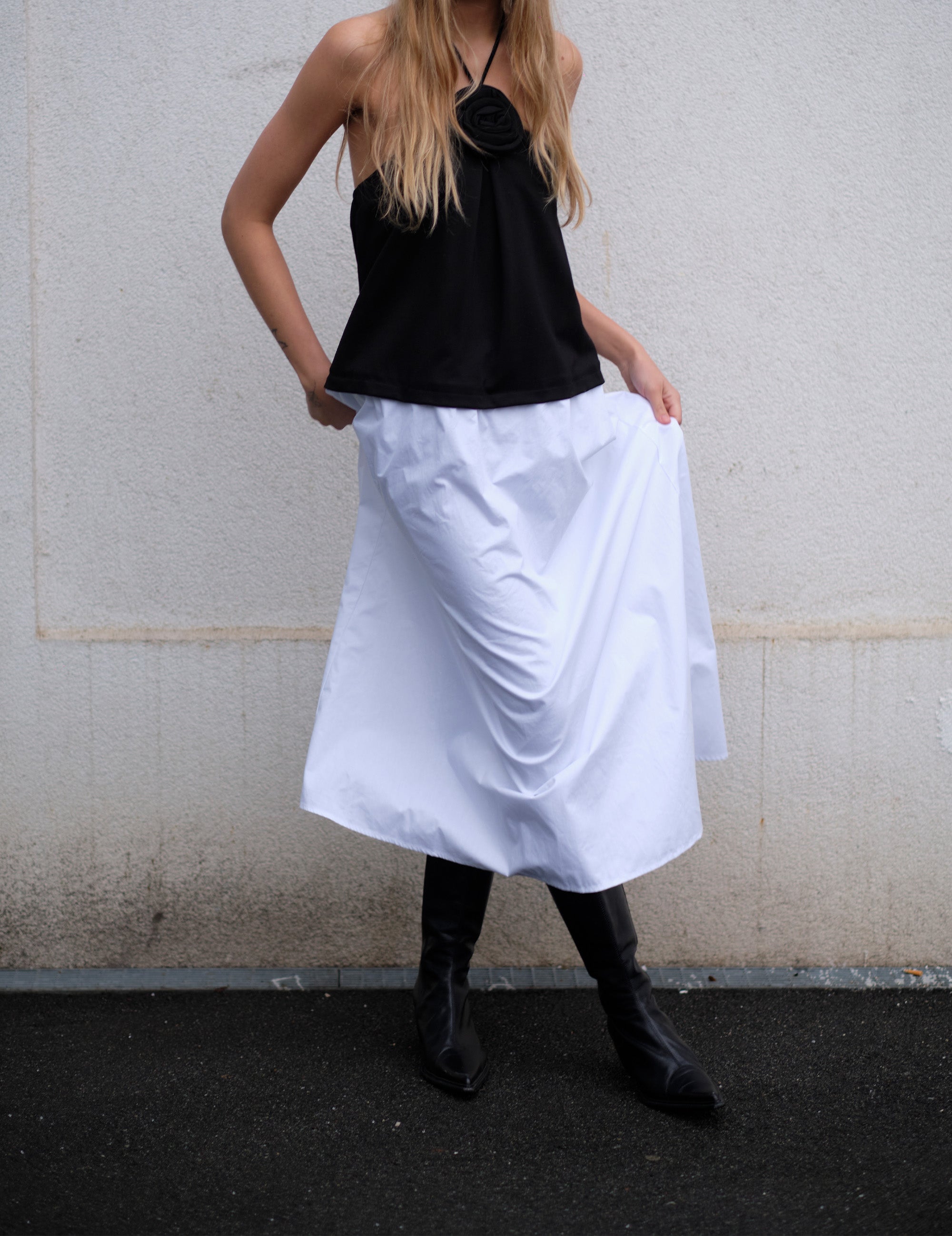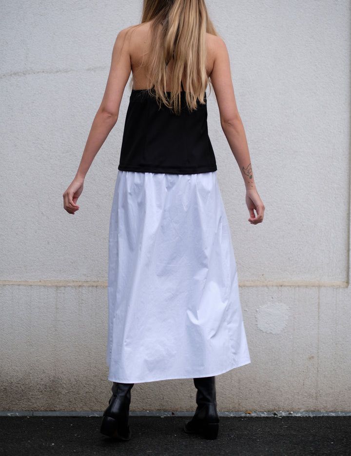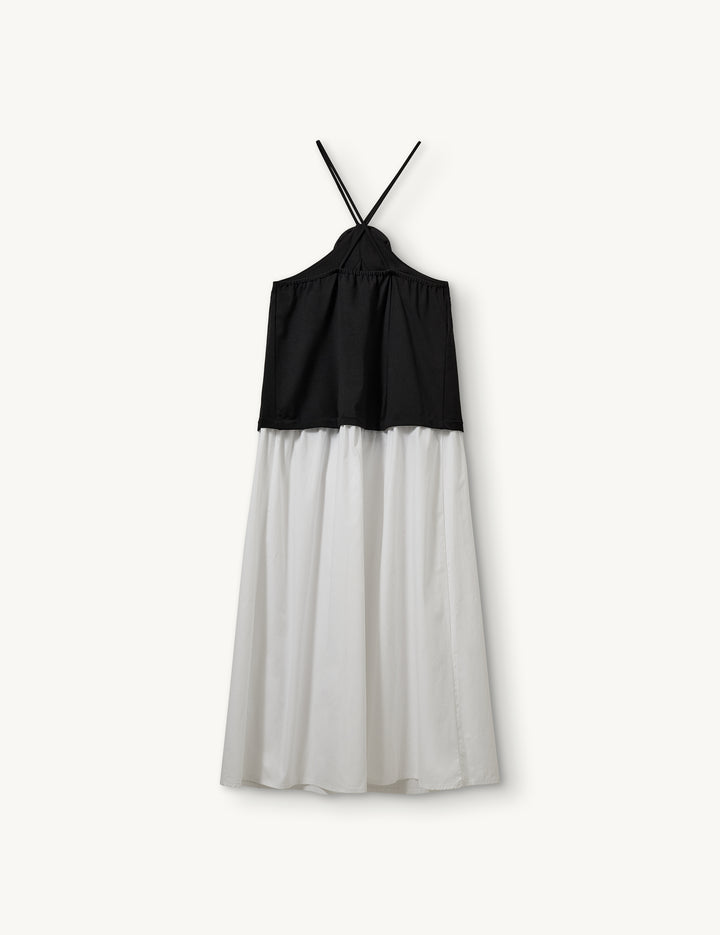 The Rosie Gown pairs a softly draped black halter top with a crisp white ankle-length skirt, creating a striking, sculptural silhouette. The neckline gathers into a graceful knot, adding structure to the top’s loose, effortless fit. Refined yet relaxed, this two-tone gown is designed for movement and presence—perfect for moments that call for quiet impact.