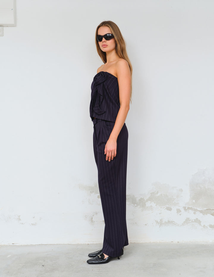 The Zoe Boob Top is tailoring, deconstructed and reimagined. Cut from navy suiting fabric with classic white pinstripes, this bandeau-style top channels confident femininity with a hint of playfulness.